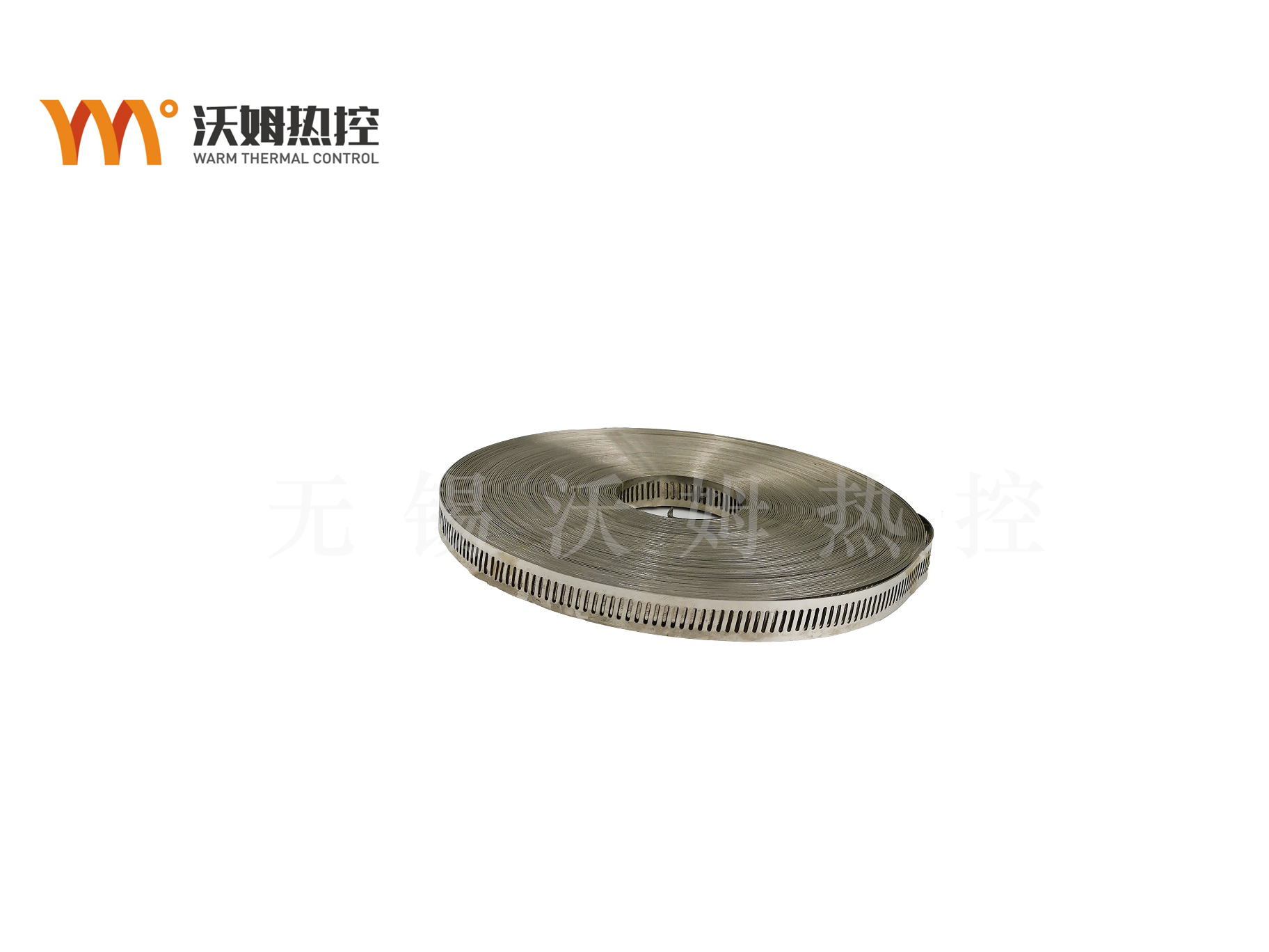 由10mm寬1.0mm厚連續長度的不銹鋼扎帶以及固定螺絲所組成。它可以將接線盒等附件固定在管道上。鋼帶可根據管徑大小,按實際需要長度剪切。安裝時,調節時,調節固定螺絲,即能將接線盒或其它附件固定在管道上。